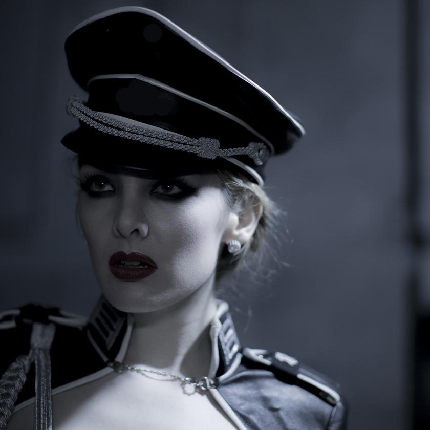 Shown with Military Armour, Military corset in black and white, leather opera gloves, and bespoke leather thong