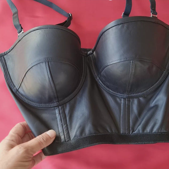 Luxurious longline leather bra, perfect for wearing under a corset or on it's own, lightly boned and underwired for support.